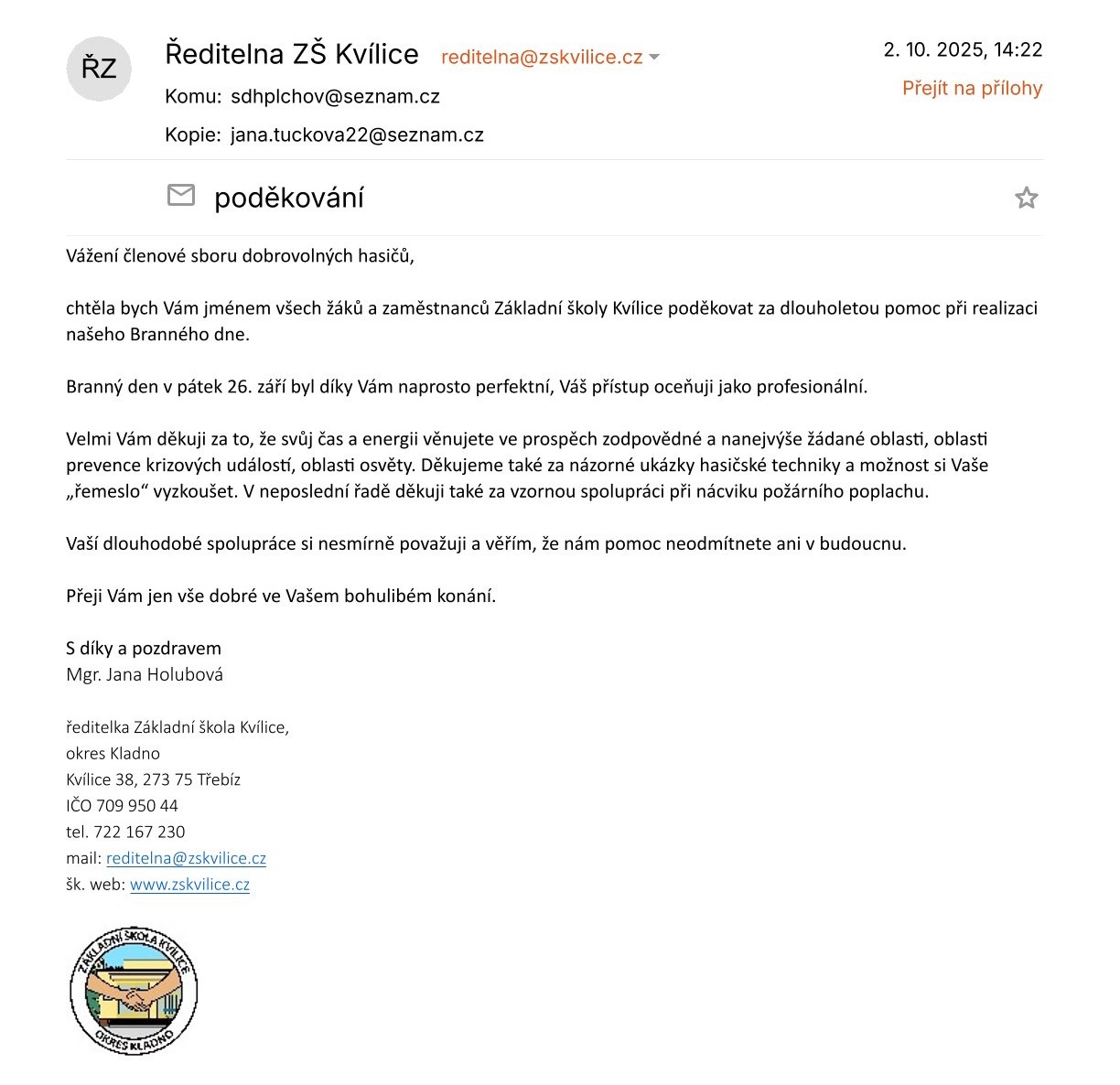 Dne 02.10.2025 jsme obdrželi poděkování paní ředitelky za naši účast při přípravě a realizaci Branného dne ZŠ Kvílice. Velmi si toho vážíme. Děkujeme.