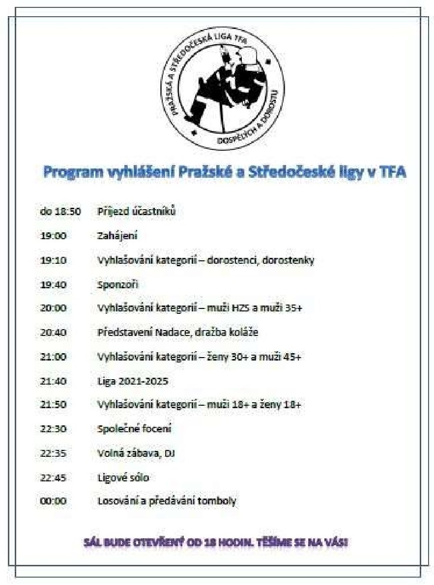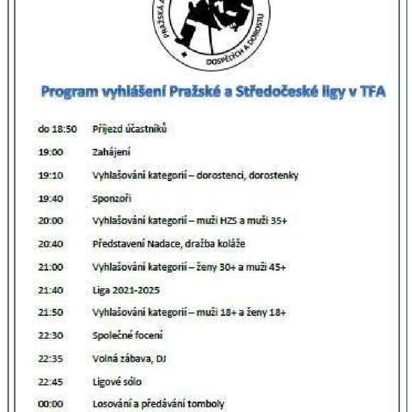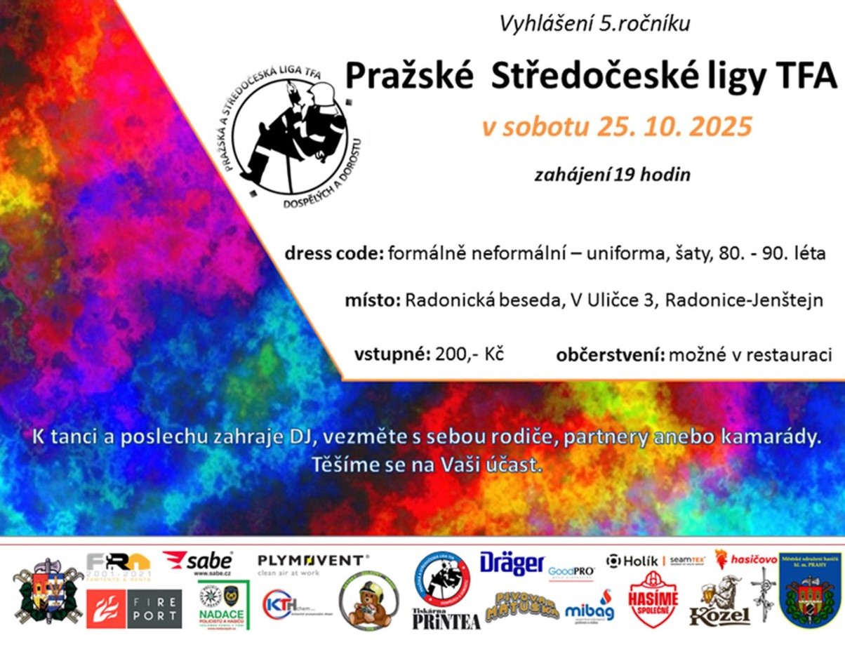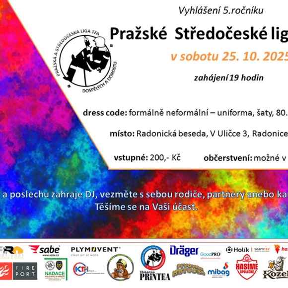 25.10.2025 SDH Plchov reprezentoval na vyhlášení 5. ročníku Pražské Středočeské ligy TFA. Na akci se sešli sportovci a sportovkyně, kteří se pravidelně vídají na závodech - ve sportovním, uběhaní, špinaví a na závěr svého výkonu i řádně vyčerpaní. Teď byl plný sál slavnostně oblečených lidí, sportovci byli k nepoznání. Vyhlášení bylo perfektně připravené, ke každému vyznamenanému byl připraven videomedailónek a krátké shrnutí k jeho úspěchům, které nabídli konferenciéři. Po vyhlášení všech kategorií a poděkování sponzorům následovala volná zábava plná příjemných a pro tuhle partu "kulturně nevšedních" setkání. Děkujeme za pozvání!